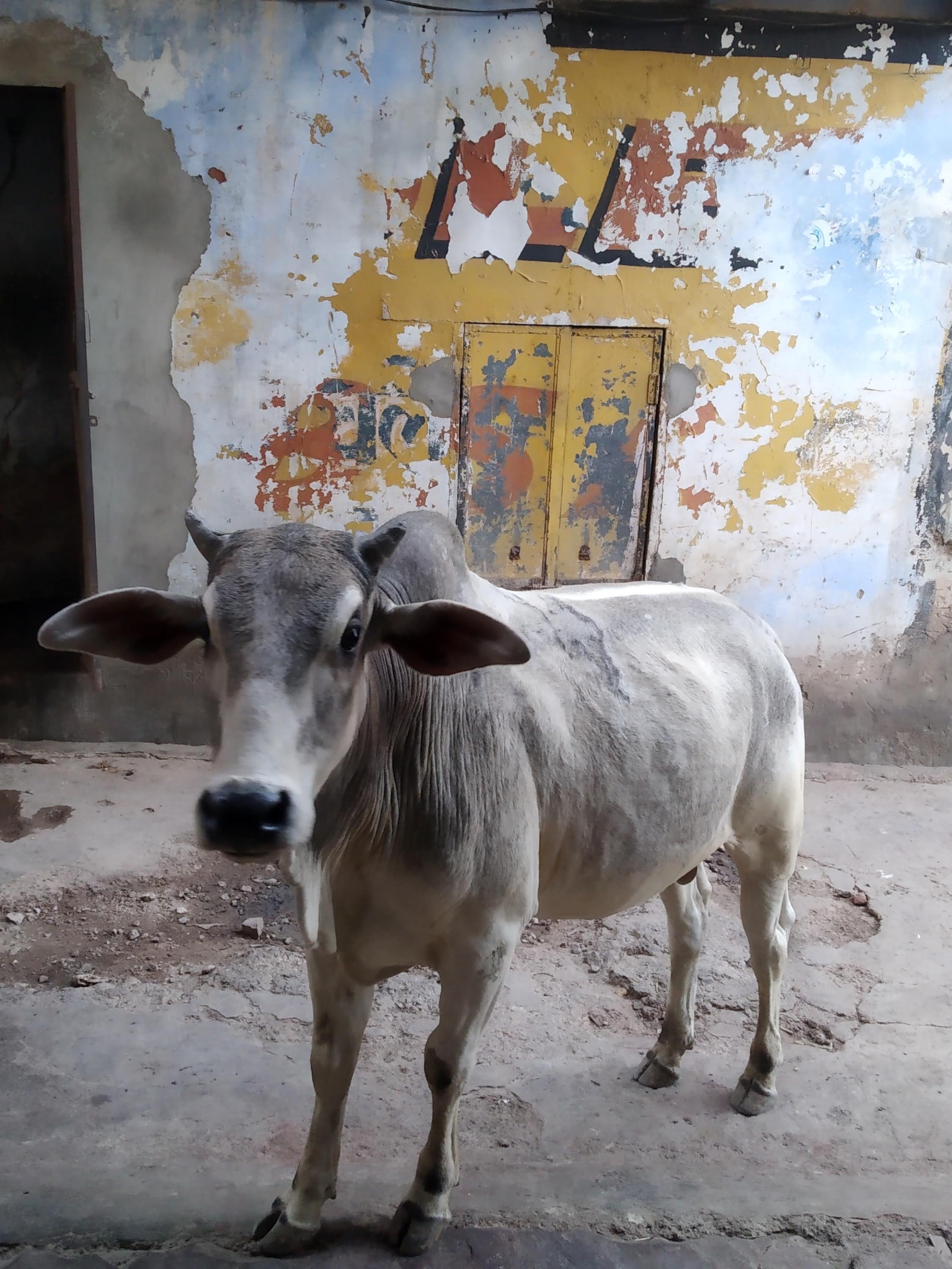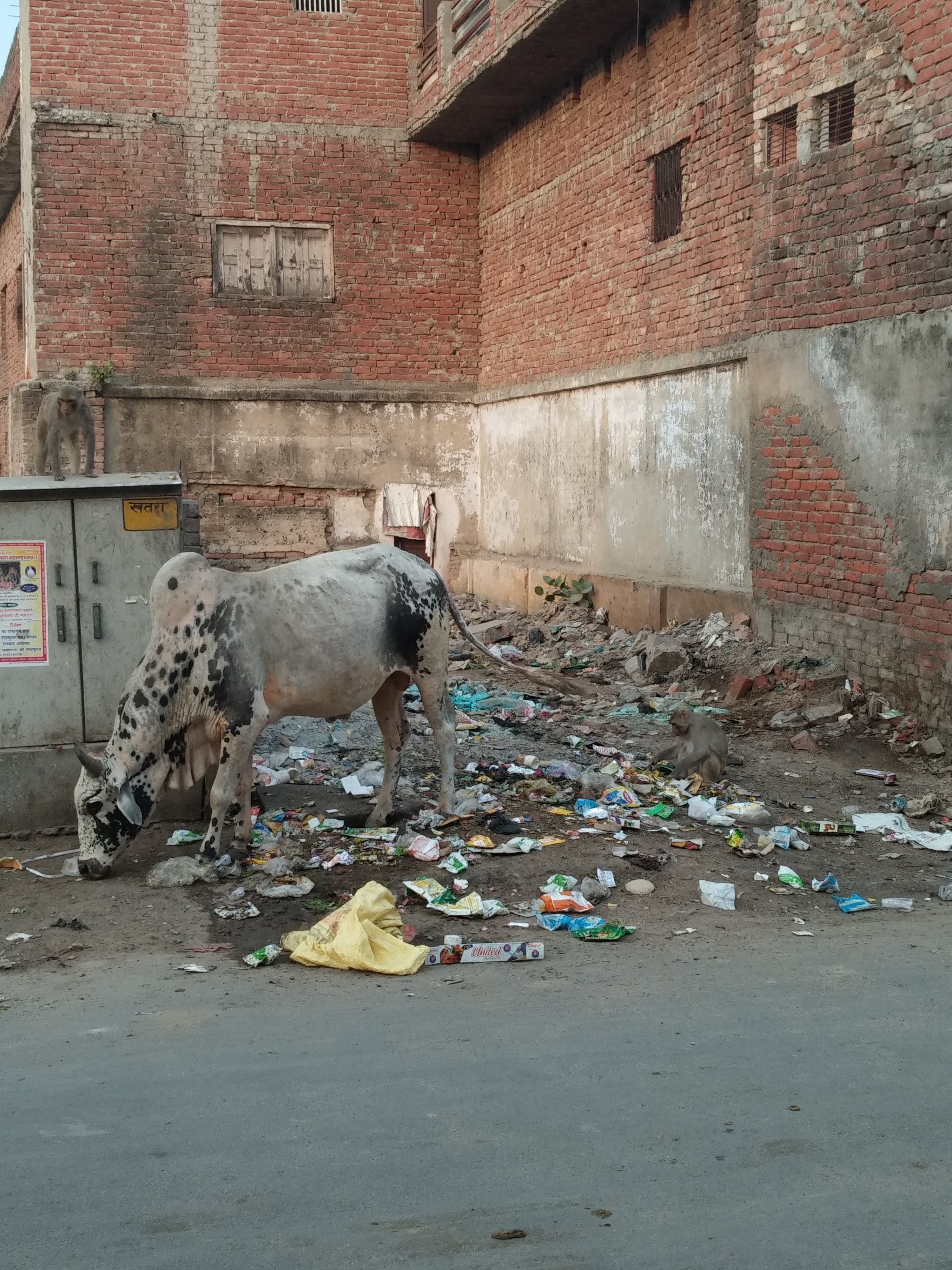 monkey and cow having breakfast