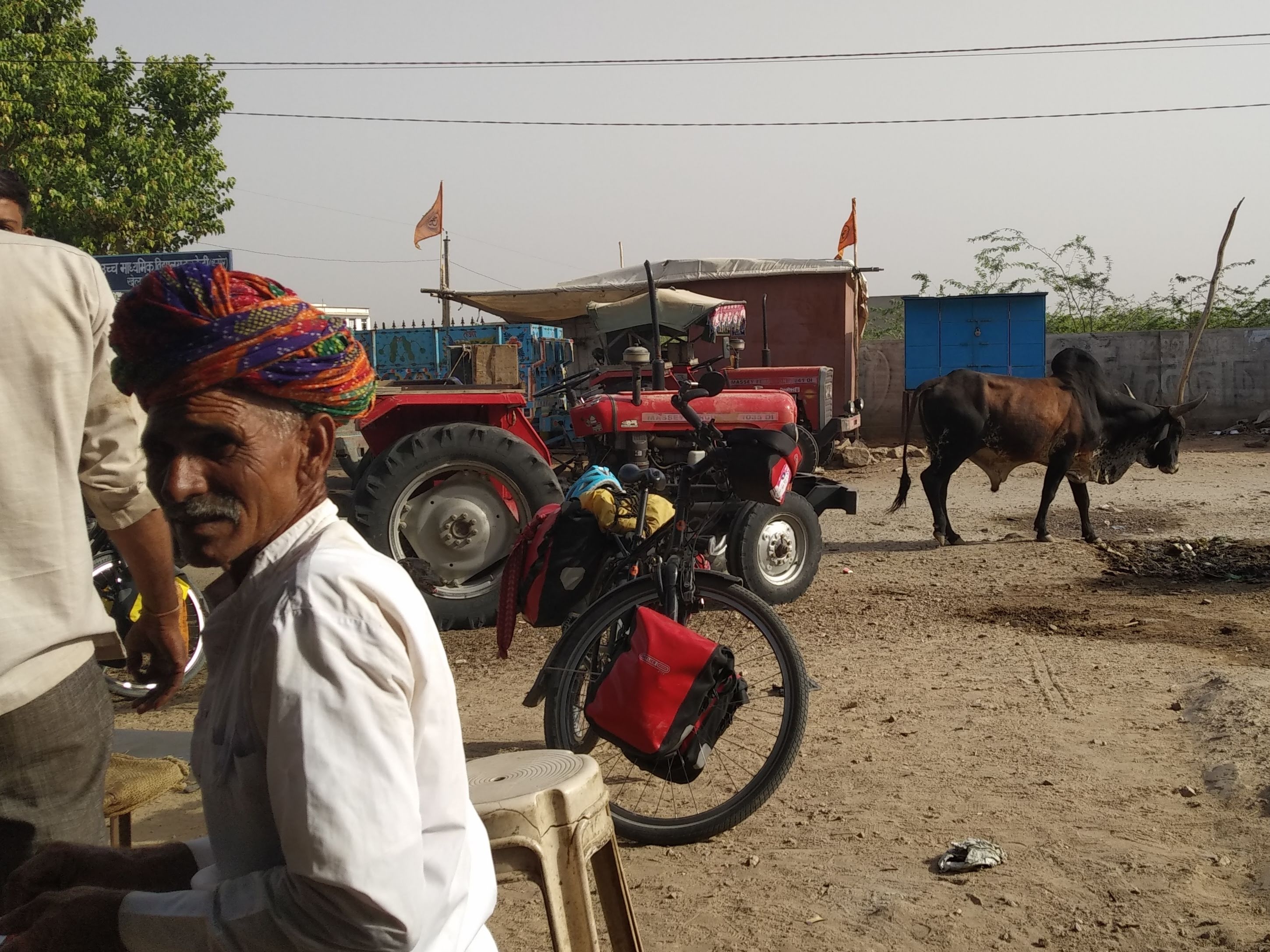 Because it is so hot, we drink lots of water. Finding drinking water is sometimes tricky because normal tap water can make us sick. In this part of India most of the big fuel stations and restaurants have drinking water and when we are in remote areas we use purification tablets. Searching and drinking around 4 liters per day, makes us have lots of cycling breaks and talks with the locals.