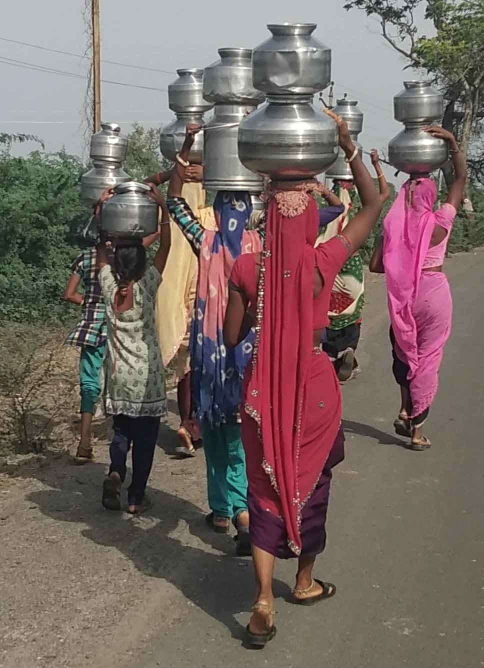 Women and children walk long ways to get water from the nearest source. The women have gorgeously coloured sarees, a dress that consists of many meters of carefully plaited fabric. They carry the water on their heads in big jerry cans or metal bowls. Average 20 liters!