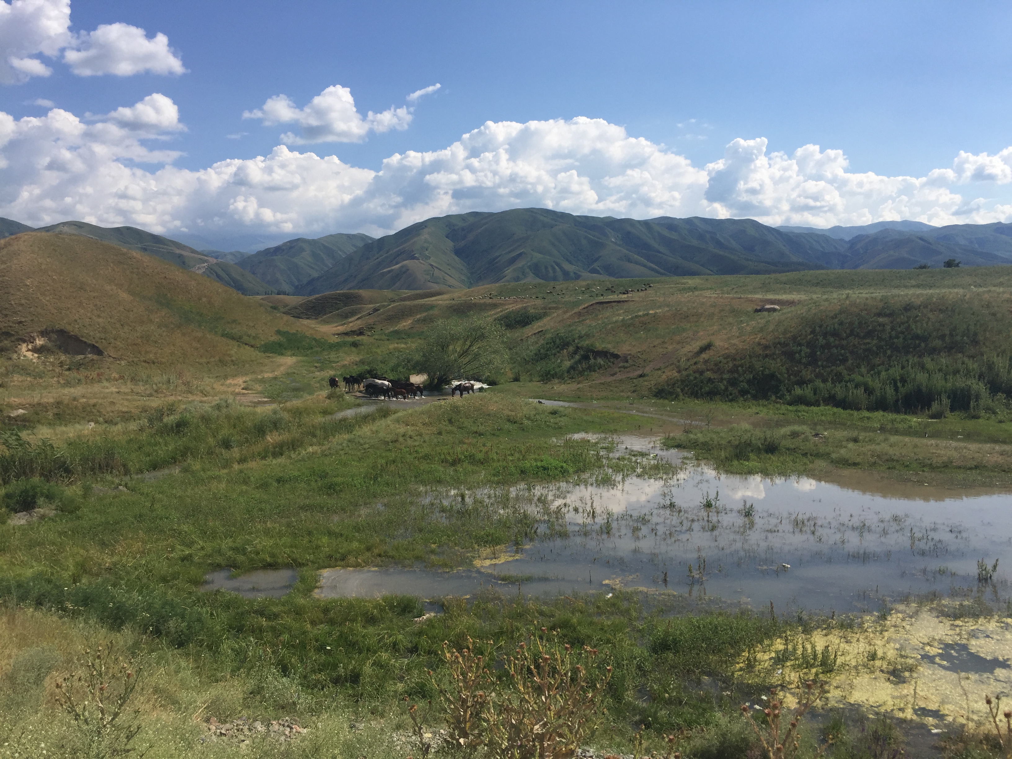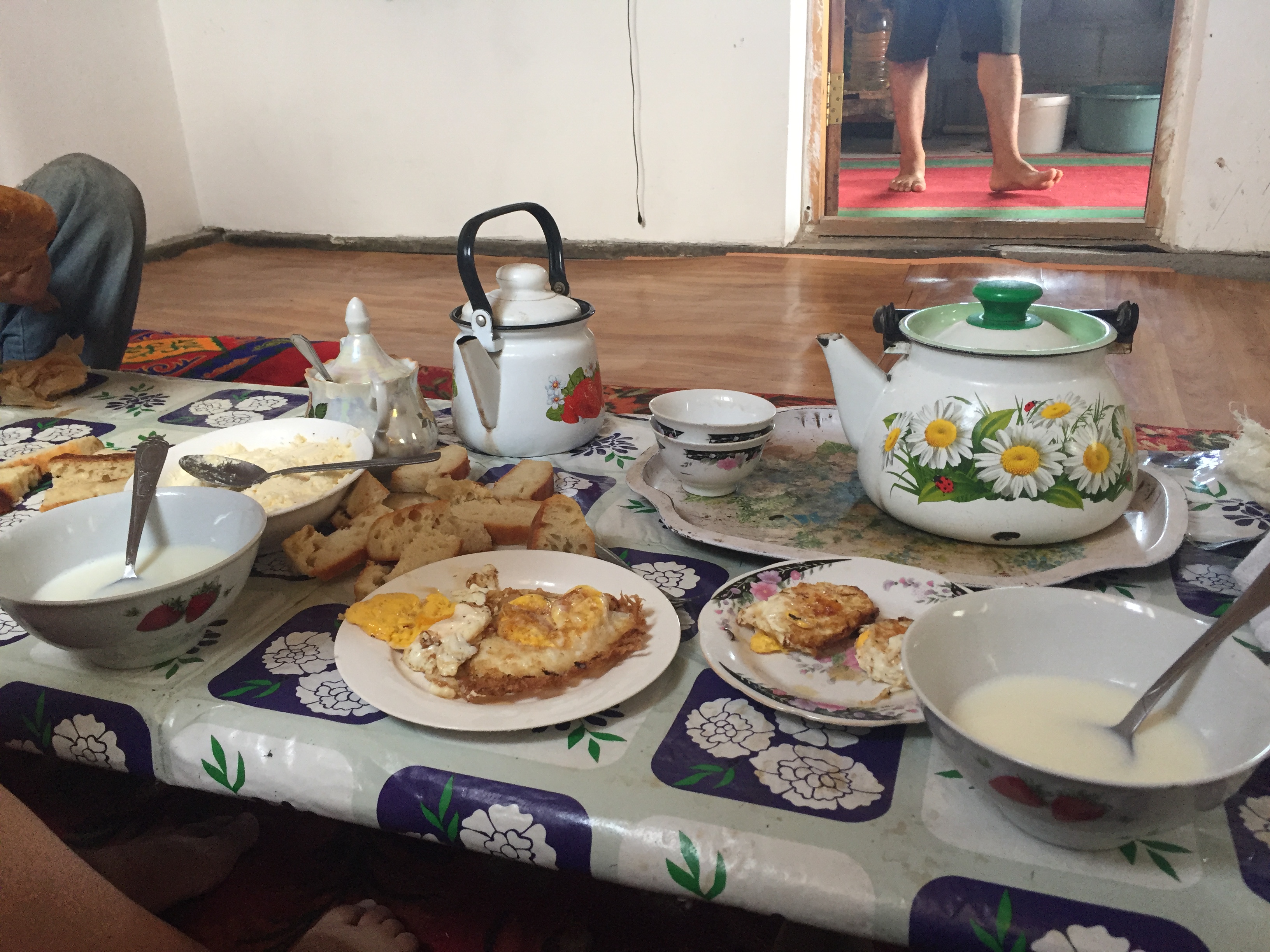 One thing that didn’t change was the friendliness of the people we met. After a few days in Almaty we started to cycle and once again we were met with overwhelming kindness from so many people. So many people wanted to say hello to us and ask us how we were and if we needed anything. A family in a huge Mercedes drove past and stopped a few meters ahead of us. They got out to talk to us and told us they were travelling 1500 km to another city. They opened the boot of their car to reveal a huge stash of provisions for their journey which they then proceeded to force on us. We have a lovely snack of home made pizza, ice tea and cookies, then when they left, they handed us a whole carton containing more pizza. Another day we camped on what we though was just open land. Apparently we were on someone’s farm, although the farmers were more than happy to host us. They gave us cooling bottles of what they called “Kazakhstan cola”, a kind of delicious cooling yogurt drink, made from the milk of their own cows. We also visited their farmhouse where they fed us with homemade bread, butter and fried goose eggs again all from their own farm. Kindness can be so delicious.