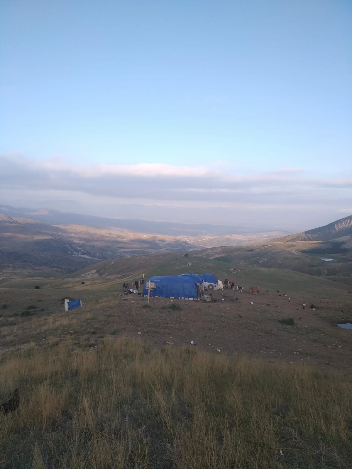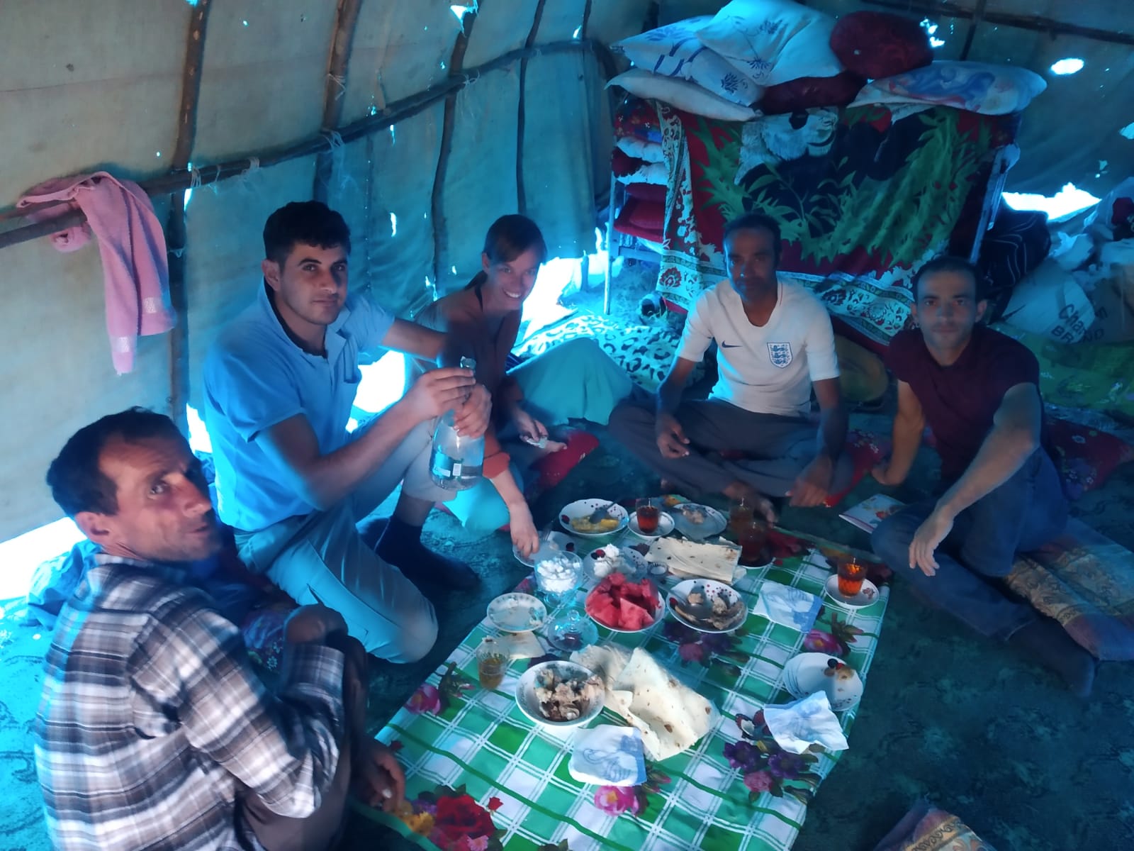 After another 1.5 hours of grueling cycling we finally reached the rendezvous point. A couple of the guys met us by the road and they pointed to some tents even further up the mountain that we had to trek to. We were already pretty shattered by now so only the thought of some Azerbaijani hospitality kept us going. At the top of the mountain was a tiny settlement of about 4 or 5 tents which were inhabited by the family of the guys we met. All the uncles, aunties, mothers, fathers and grandmother were all extremely welcoming. We were taken into one of the tents where, very quickly, a huge spread was placed on the floor and everyone started getting stuck in.There was tea, beer, vodka, cheese, bread, eggs, vodka, chicken and last but not least vodka. About every 5 minutes my glass was filled with vodka and I was expected to down it. I could see that not all people were downing their vodka so I also adopted this tactic but this didn’t seem to work so well with the throat-slitter and eventual I would have to drain my glass. Each time I did there was lots of laughing but I think that rather than laughing at me they were just happy that I was joining in. That’s what I told myself anyway. It was around about now that the throat slitting and gurgling noises started again. All the vodka was making me second guess our safety again.