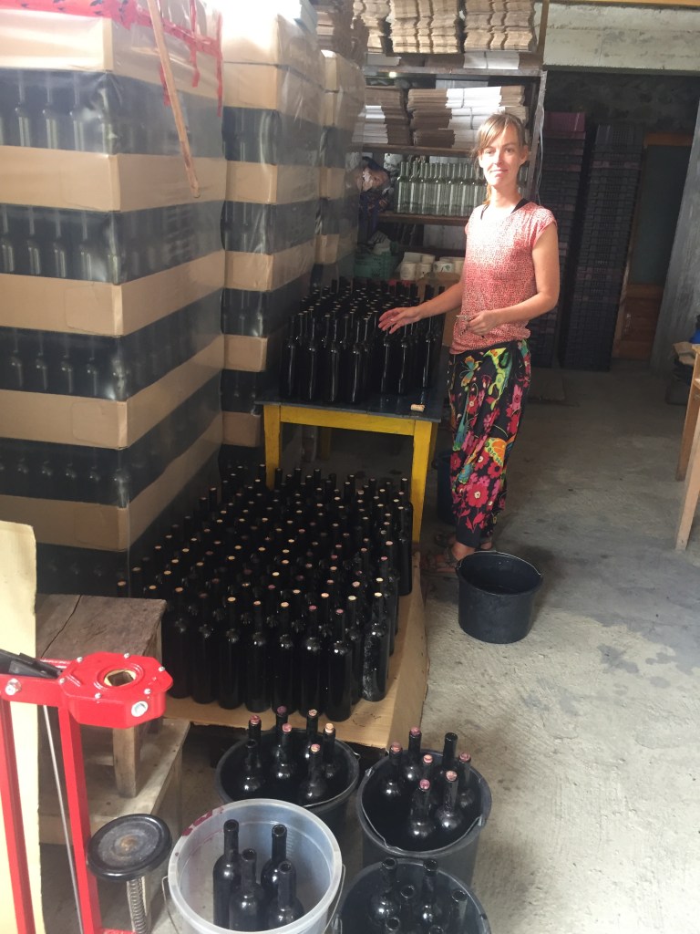 Most people don’t know that Georgia is one of the oldest wine producing countries in the world. There is evidence of wine production from 8000 years ago. When we entered Georgia from Azerbaijan we directly entered the most famous wine region in Georgia. Everywhere we cycled we saw signs for vineyards and almost every house we cycled by had grapes growing in their front garden. It wasn’t long before we found ourselves at “Artanuli wine” vineyard. A vineyard that Frouke found on googlemaps and decided to contact purely because the picture they used was a picture of a barn door with graffiti all over it. It looked cool, a bit different from some of the more fancy, traditional vineyards that we had seen so far. Frouke sent them an email asking if we could come over and help out for a few days. We very quickly got a reply saying that they were in the middle of bottling their wine and would be happy for us to come over and help them.