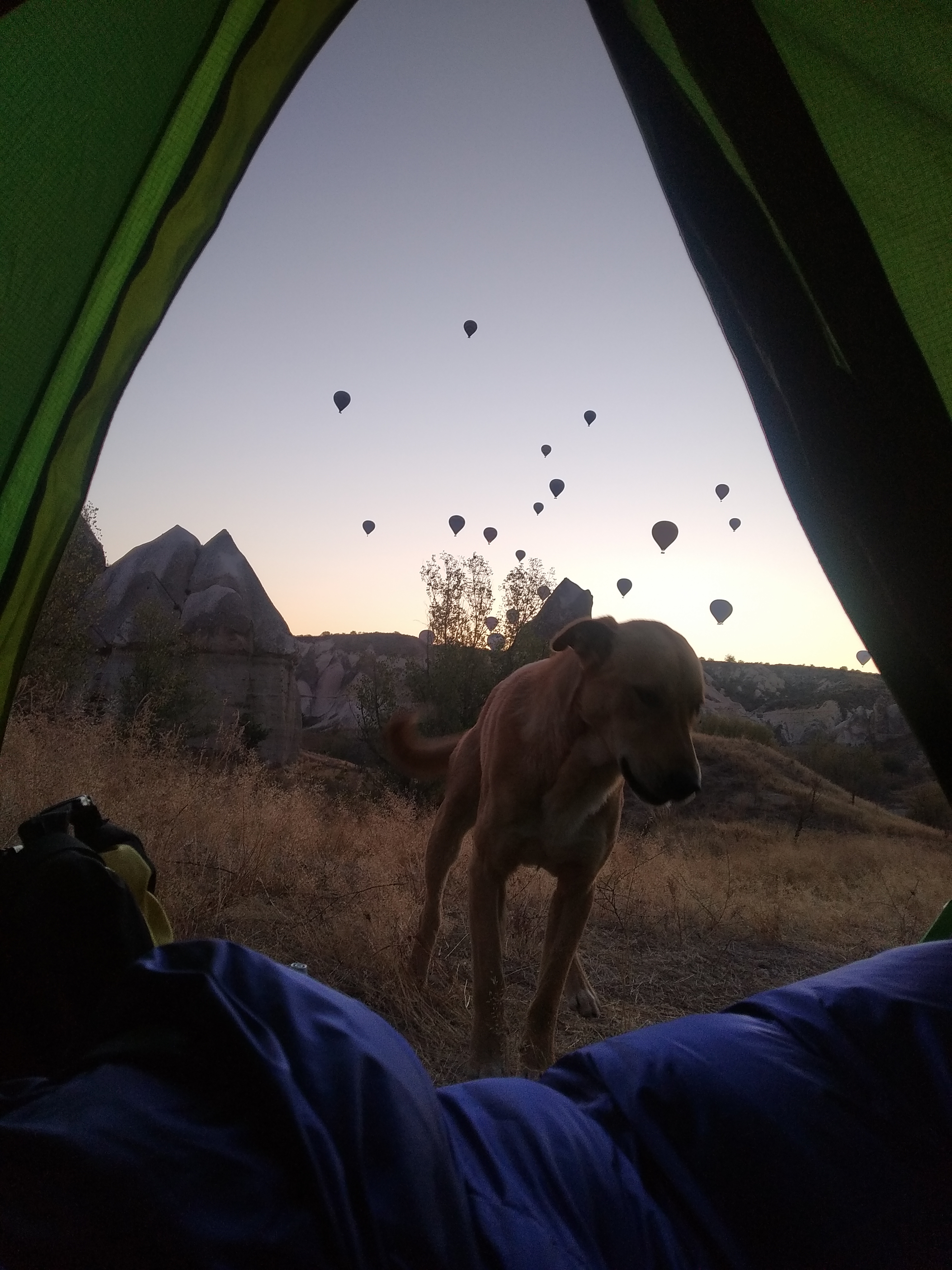 The next day we wake up with again many balloons flying over us and landing next to us! Our ‘dog for a day’ watched over us at night sleeping next to our tent, chasing the other dogs away. He is super enthousiastic to see us in the morning, almost jumping in the tent! ♥️ We have ice on our tent when waking up!